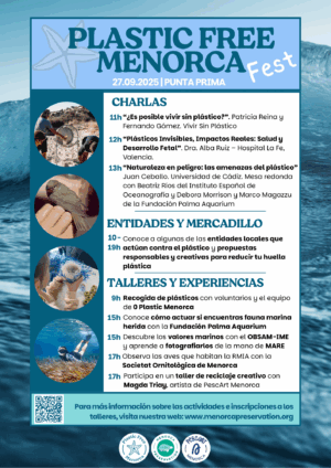 El Festival se centrará en promover charlas con expertos a nivel nacional en la problemática del plástico en diferentes ámbitos, actividades al aire libre con la colaboración de entidades como la Societat Ornitològica de Menorca, Palma Aquarium, OBSAM-IME, Certamen MARE y 0 Plastic Menorca, y un espacio de entidades y mercadillo de alternativas para reducir el consumo de plástico.